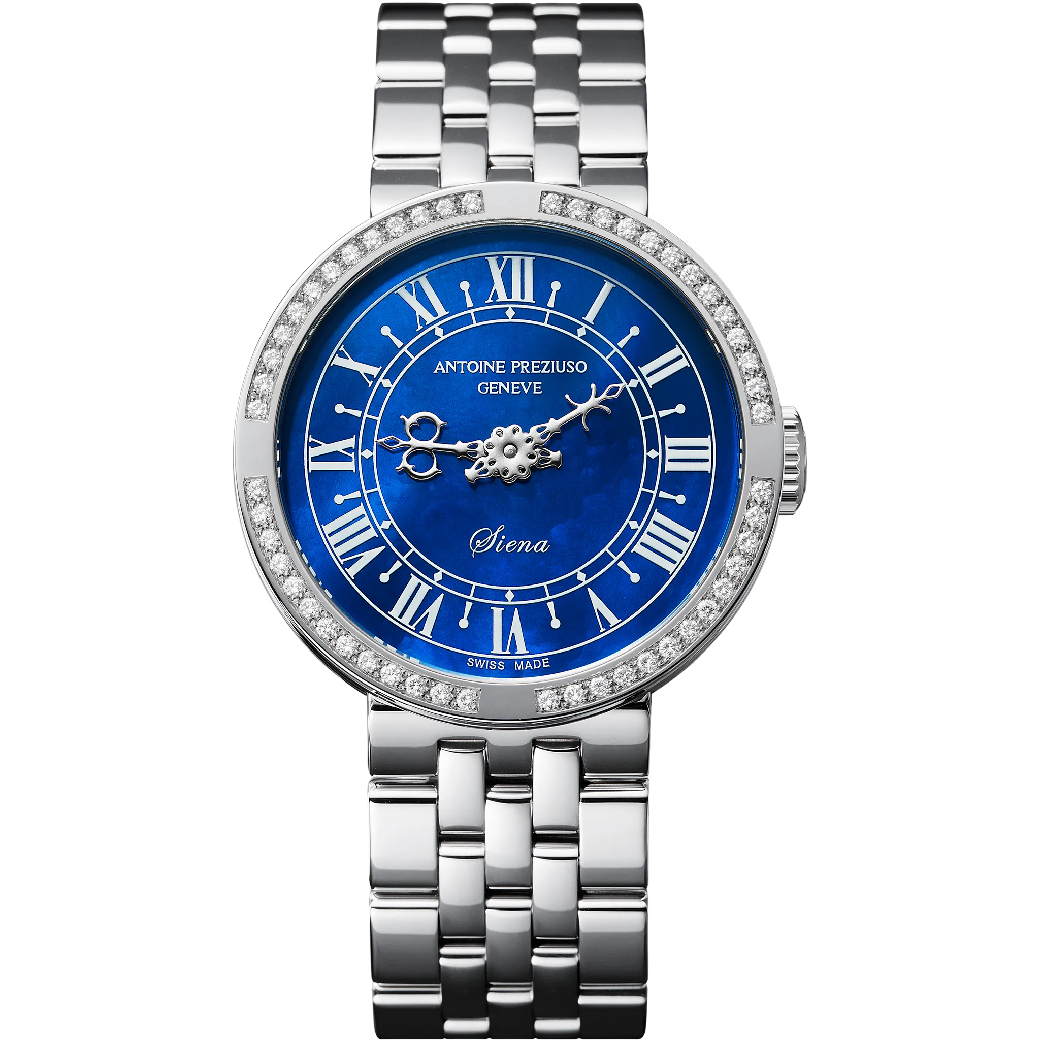 アントワーヌ・プレジウソは、自身のブランドを立ち上げる前に、世界中を旅していました。イタリア トスカーナ地方のシエナを訪れた際、世界一綺麗な広場と言われている〝カンポ広場〟に立ち寄った際、これを腕時計にしようと閃いたのが、〝マンジャの塔〟の時計でした。美しくデザインされた針は、時針1本のみで時刻を表す、中世の時計です。こうして、デビュー作〝SIENA〟が生まれました。