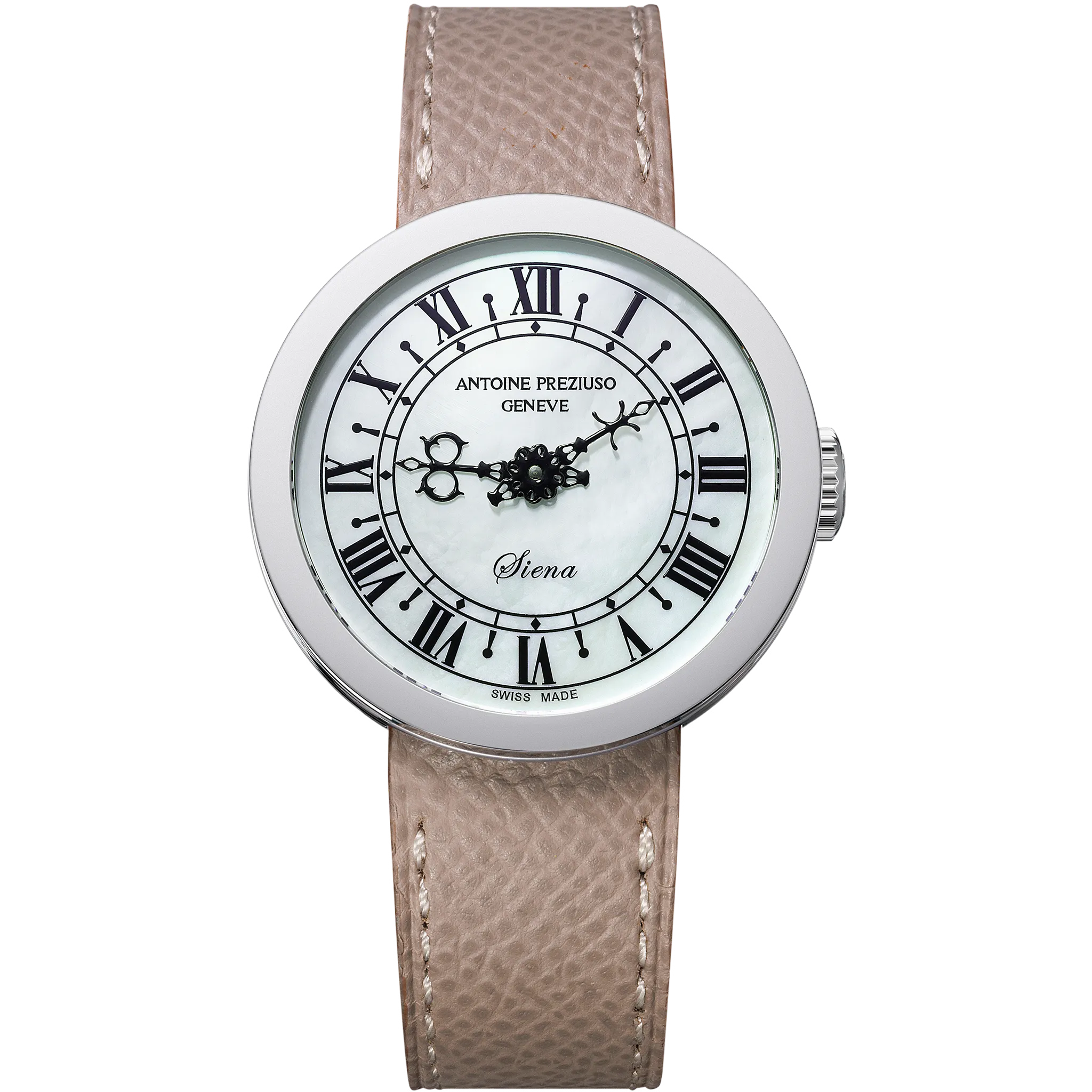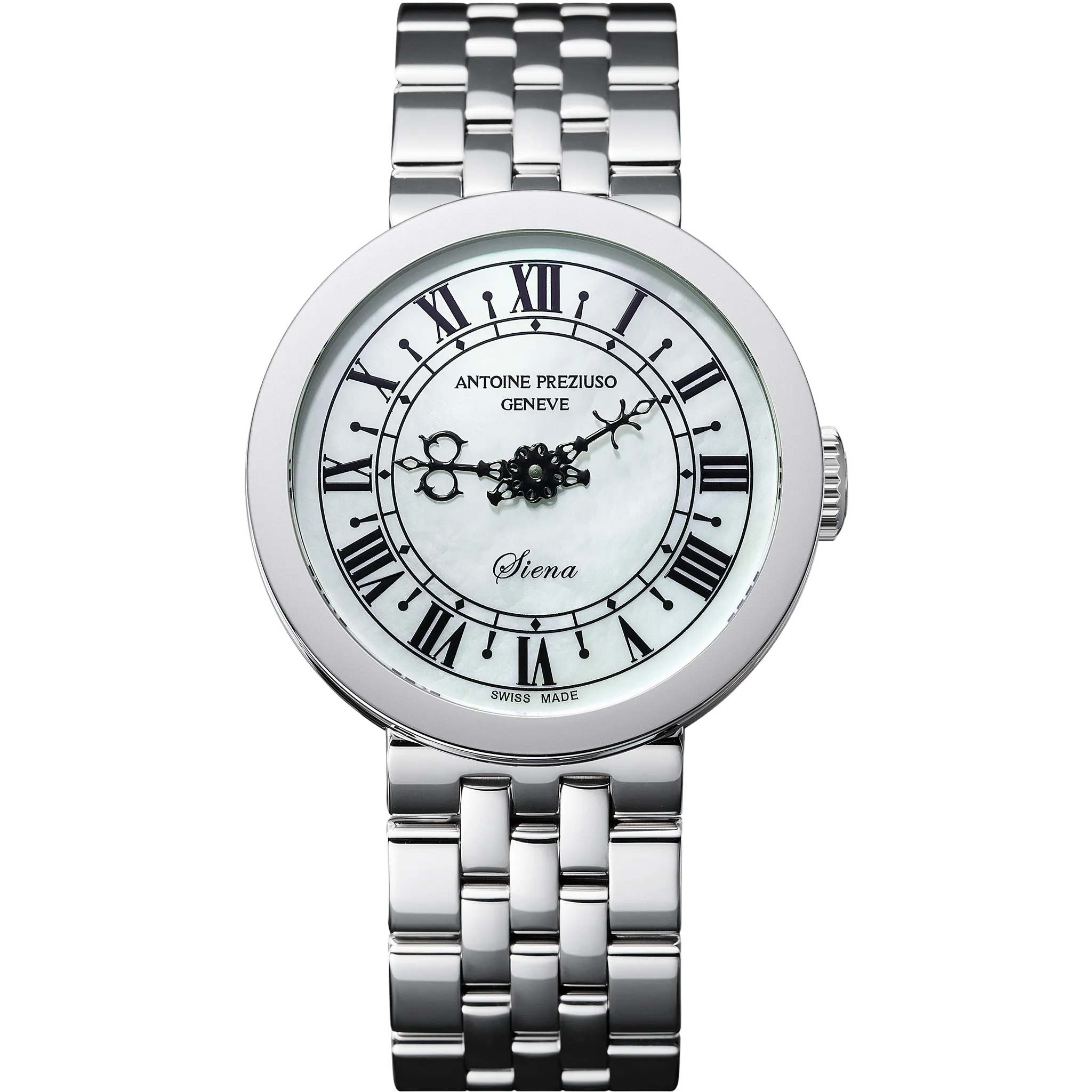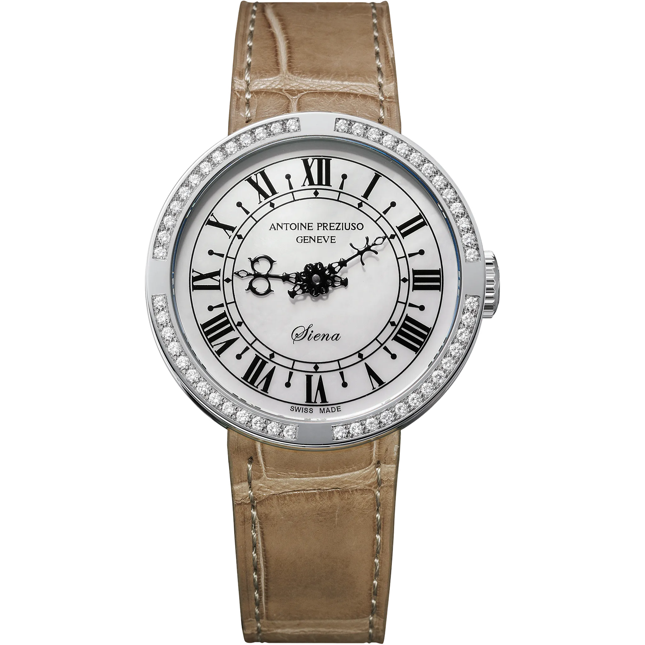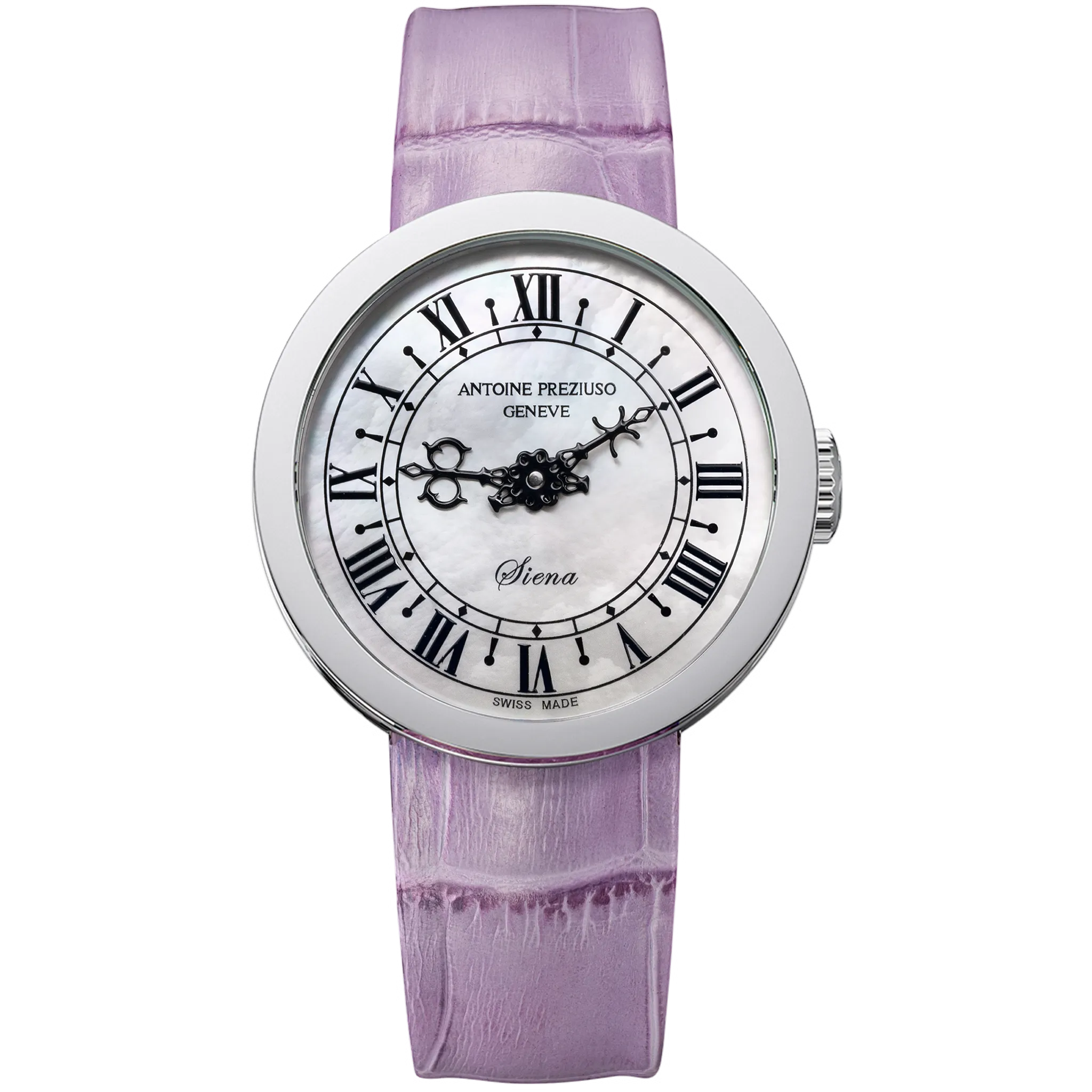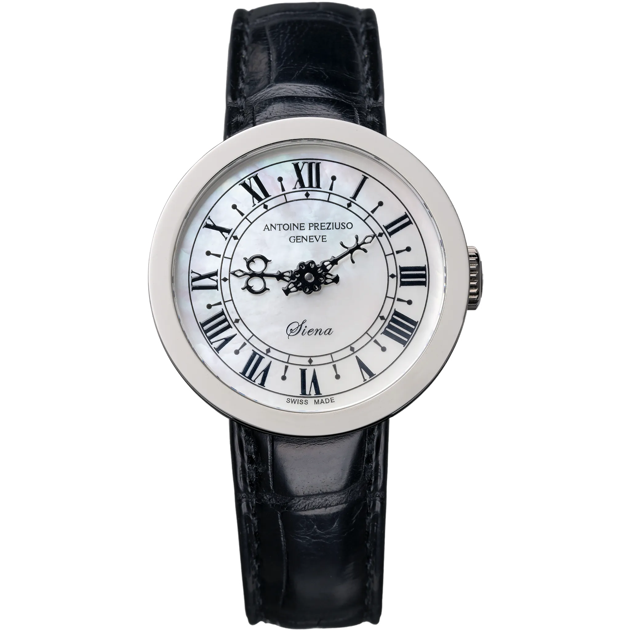 アントワーヌ・プレジウソが訪れたイタリア、シエナで「世界一美しい広場」と称されるカンポ広場の時計塔に魅せられて創作された「シエナ」。中世を想わせる飾り針とマザーオブパールのダイヤルを配した美しい紳士・婦人時計です。オリジナルモデルの1本針を視認性に優れた2本針にアレンジして復刻しました。