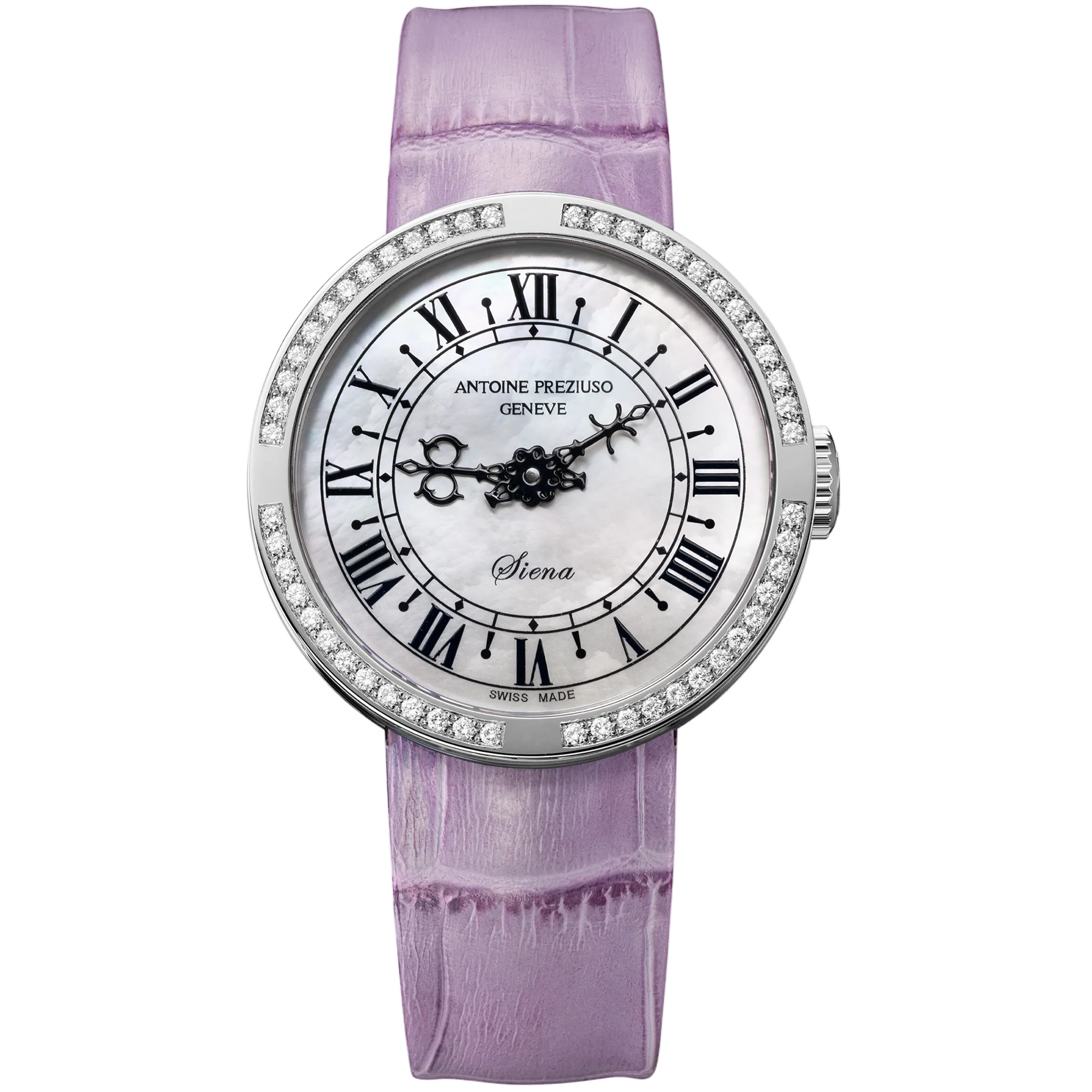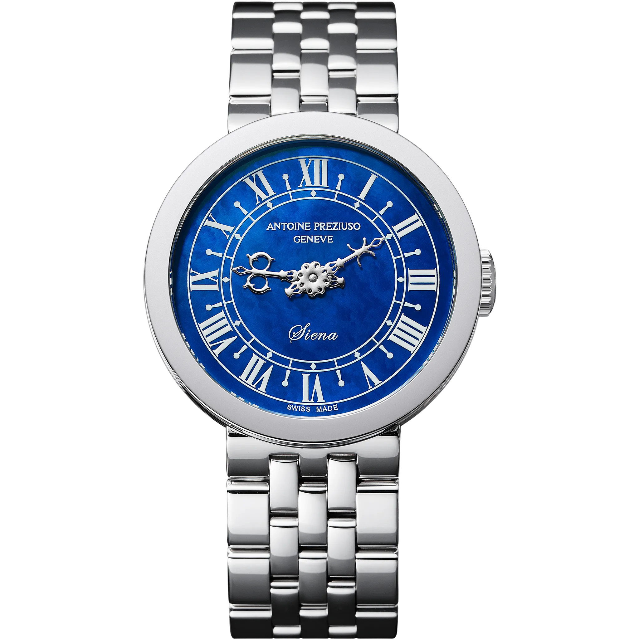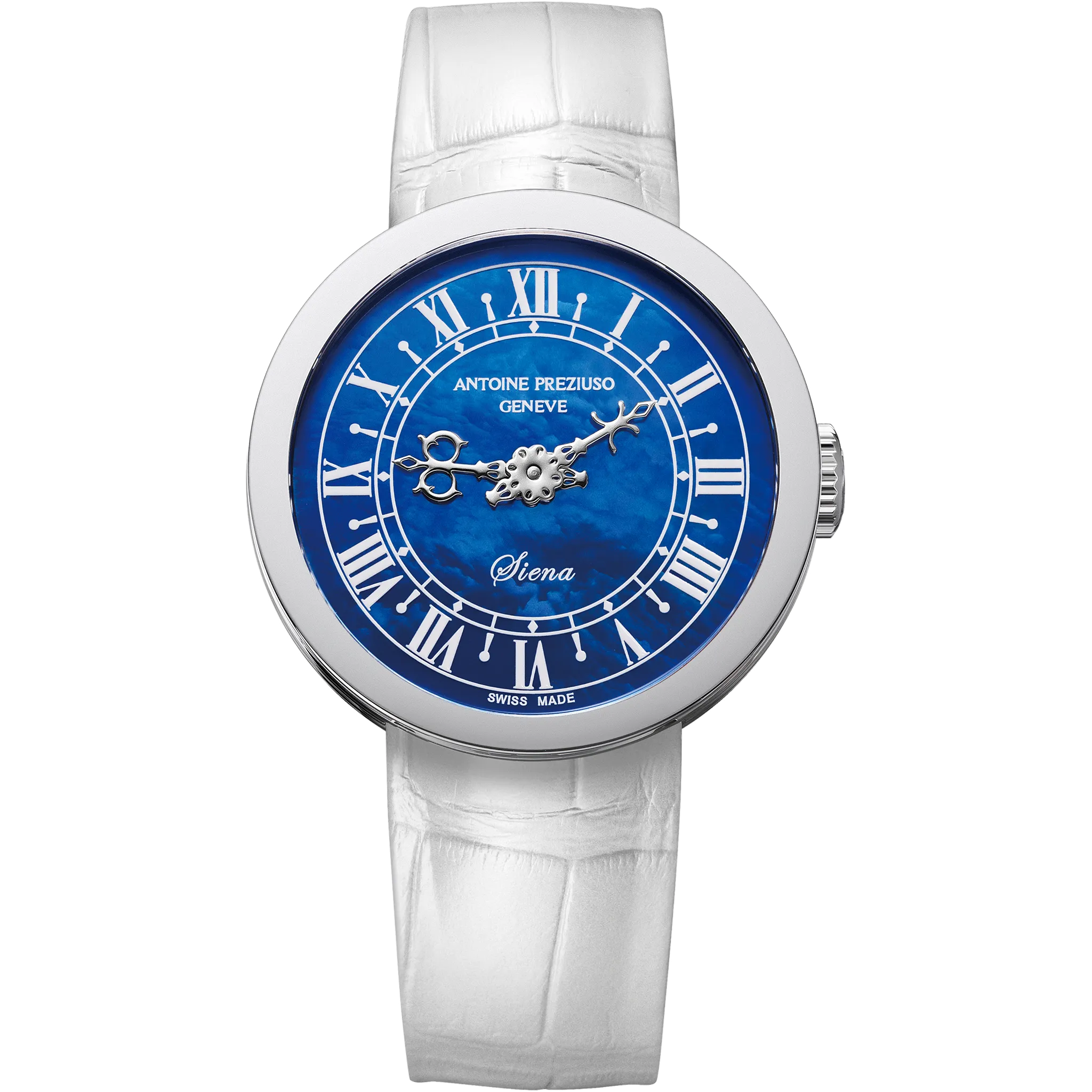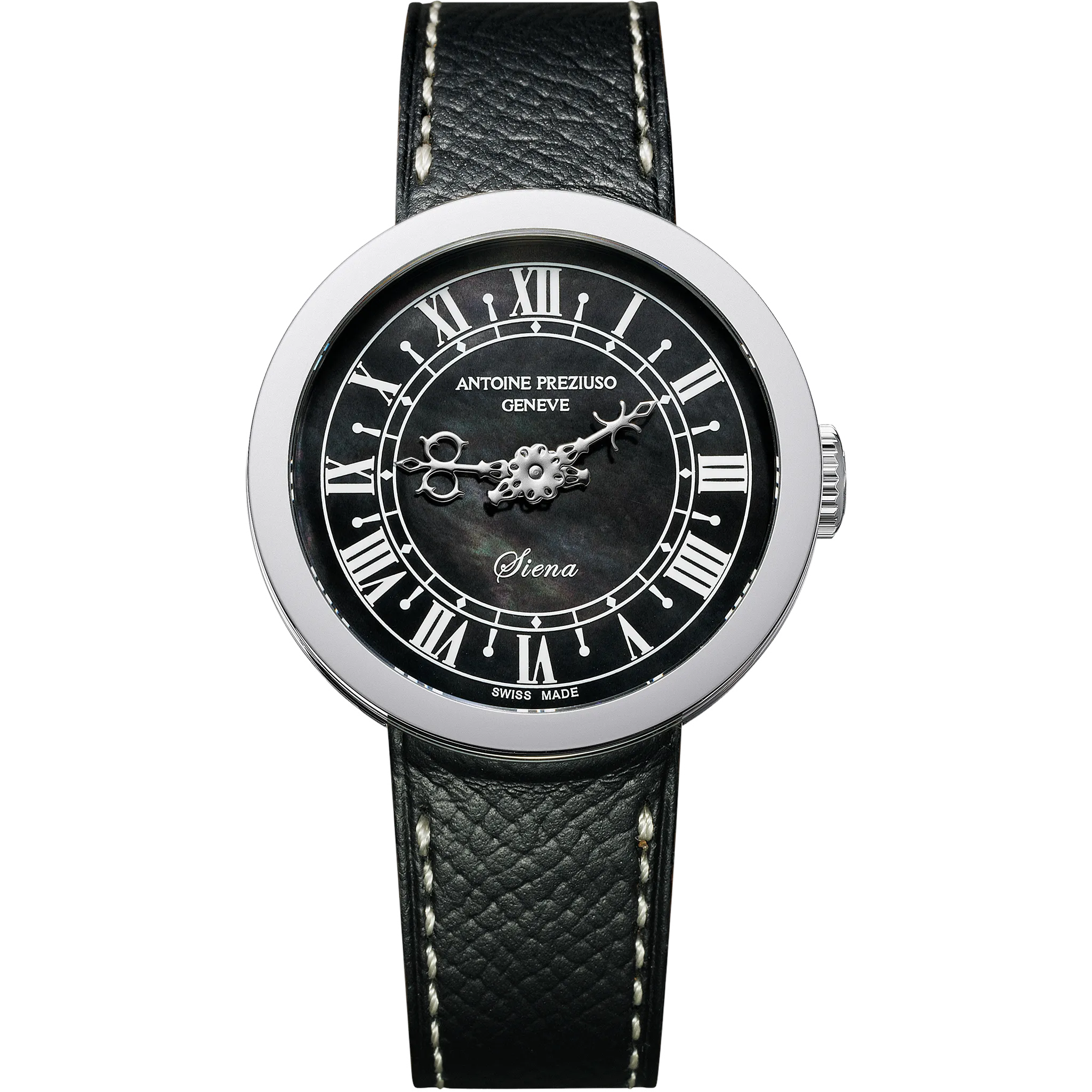アントワーヌ・プレジウソが訪れたイタリア、シエナで「世界一美しい広場」と称されるカンポ広場の時計塔に魅せられて創作された「シエナ」。中世を想わせる飾り針とマザーオブパールのダイヤルを配した美しい紳士・婦人時計です。オリジナルモデルの1本針を視認性に優れた2本針にアレンジして復刻しました。