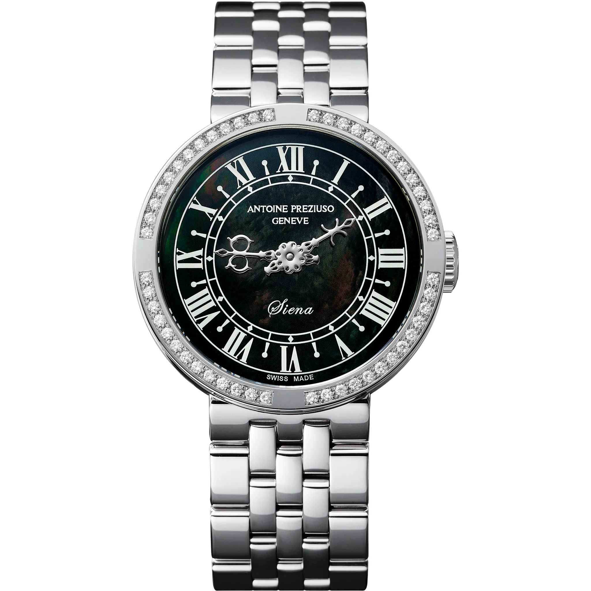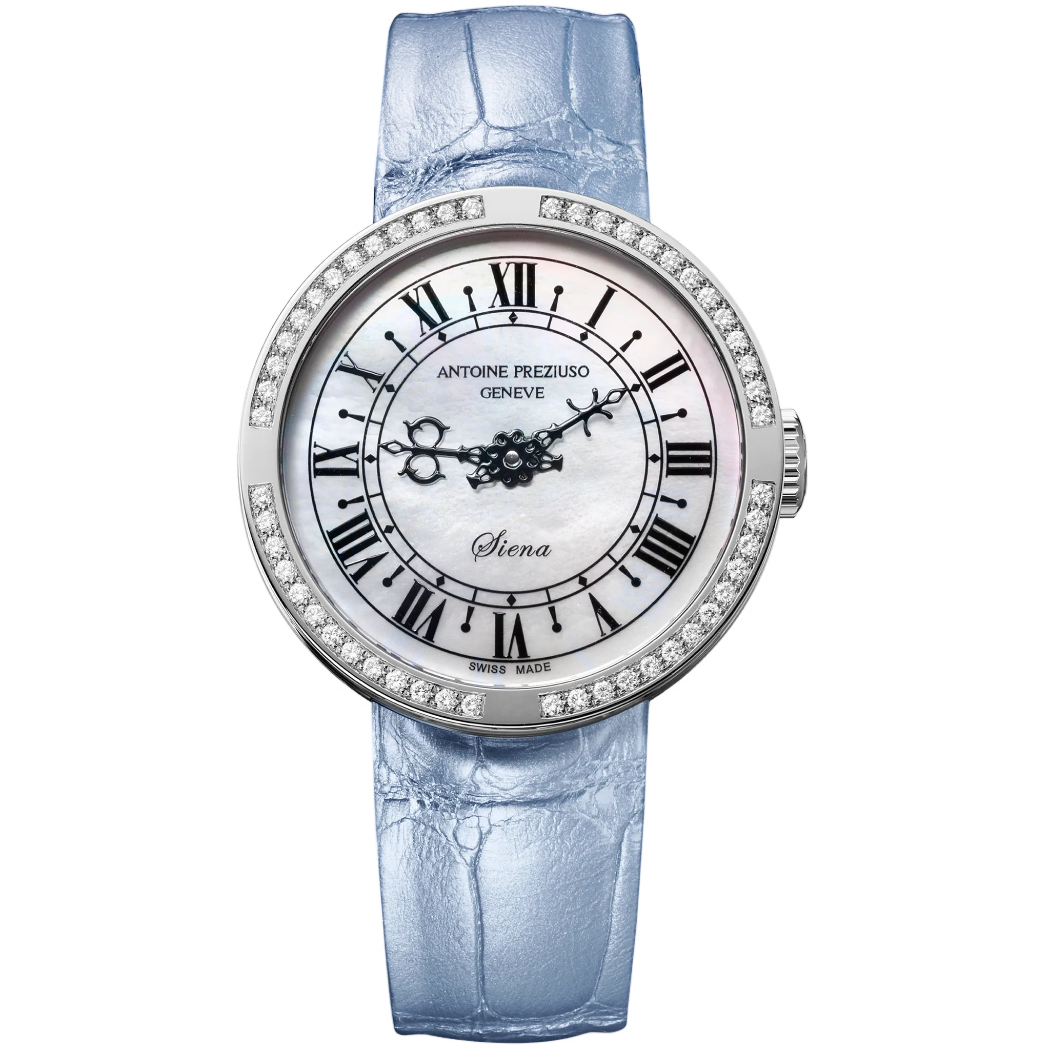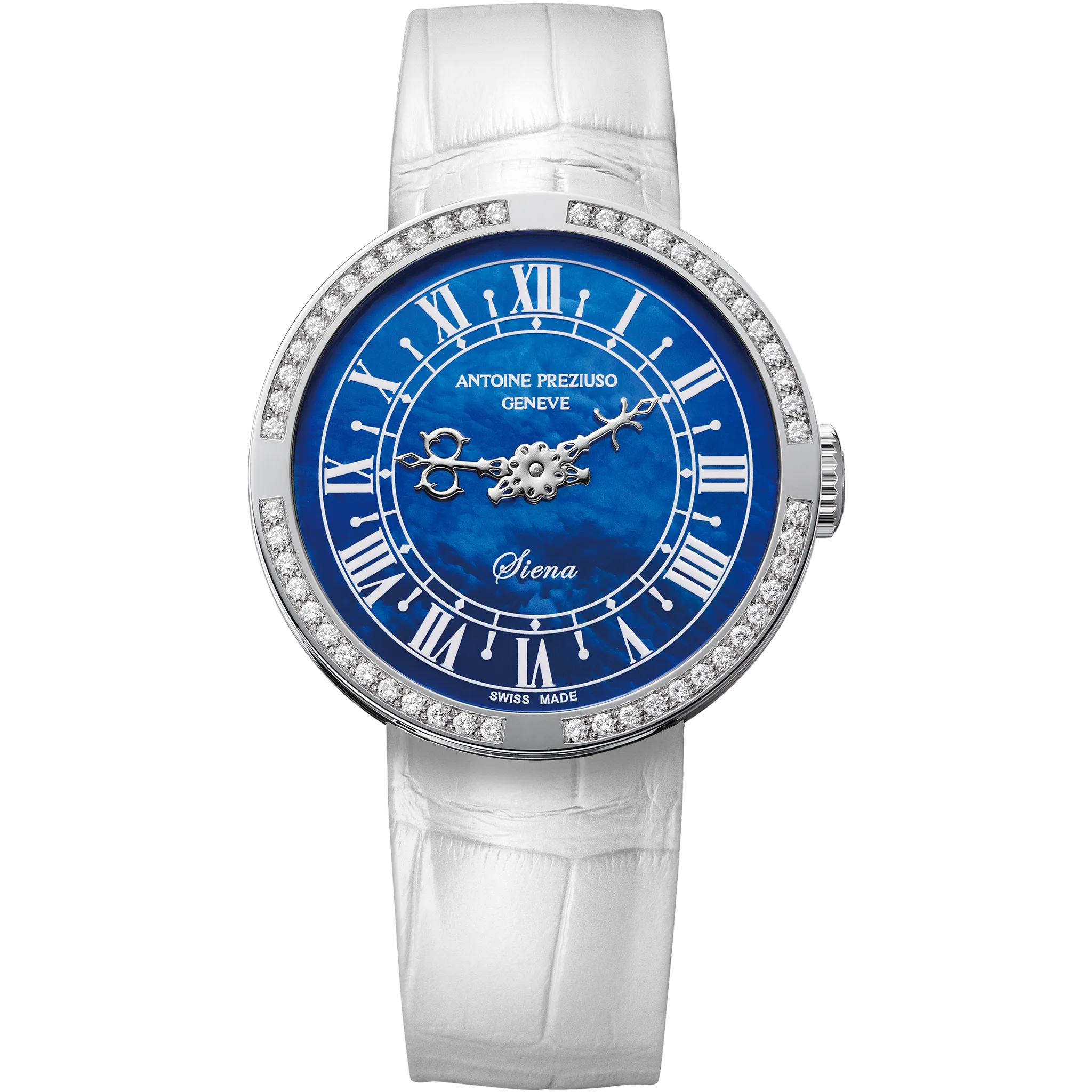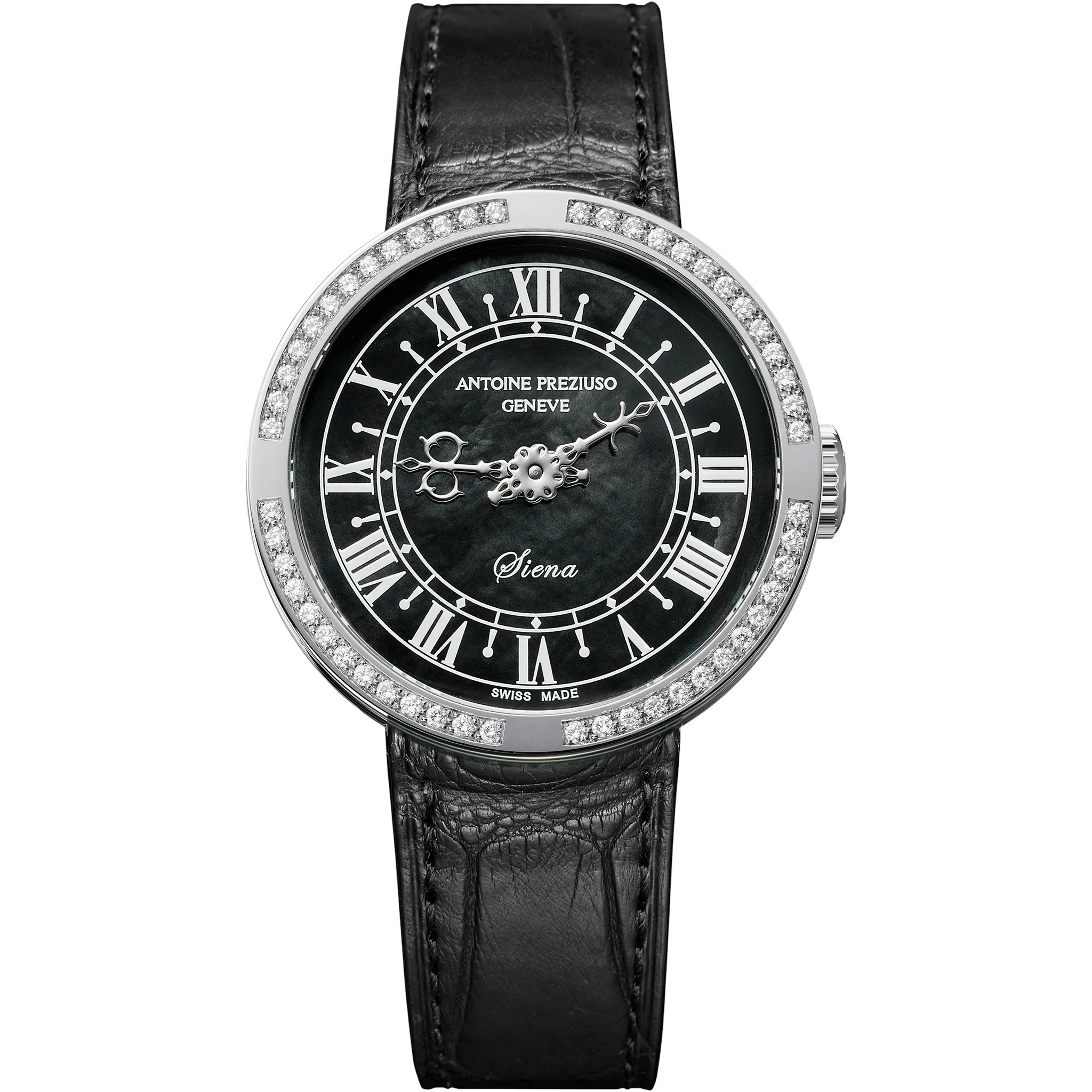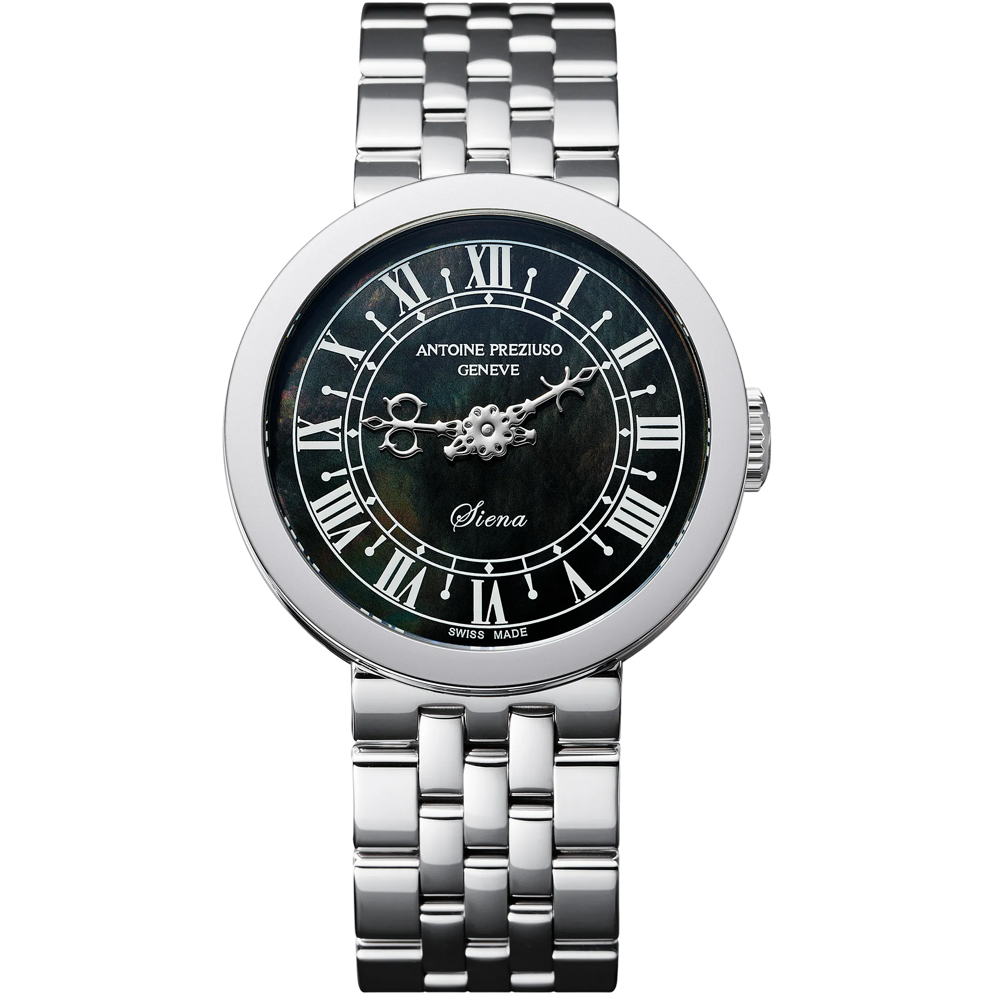 アントワーヌ・プレジウソが訪れたイタリア、シエナで「世界一美しい広場」と称されるカンポ広場の時計塔に魅せられて創作された「シエナ」。中世を想わせる飾り針とマザーオブパールのダイヤルを配した美しい紳士・婦人時計です。オリジナルモデルの1本針を視認性に優れた2本針にアレンジして復刻しました。